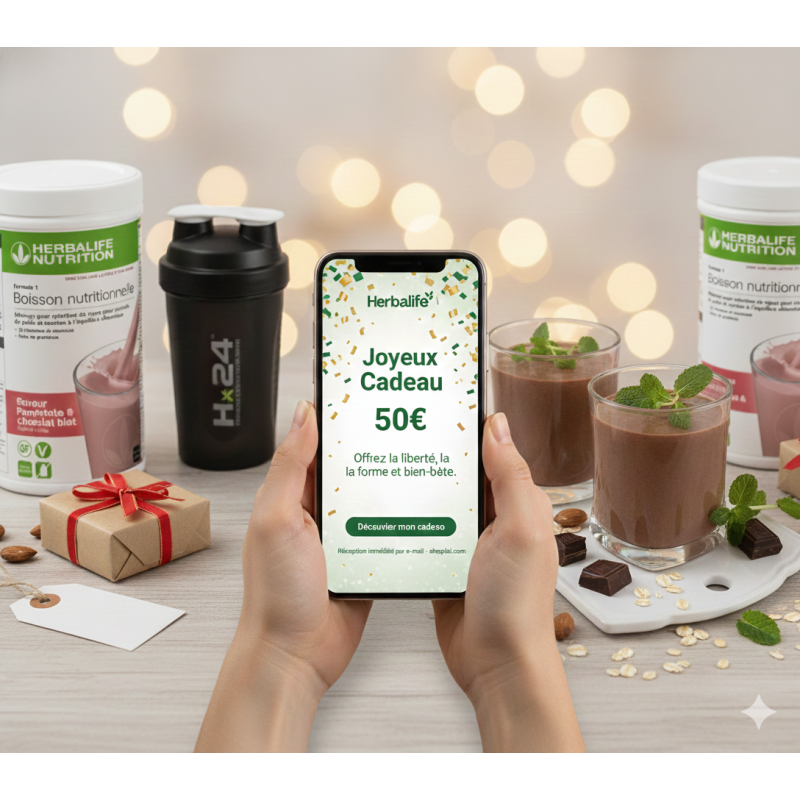 Vous hésitez entre une Formula 1 Vanille ou Chocolat ? Vous ne connaissez pas le rituel beauté de vos proches ? Le Chèque cadeau Herbalife de 50€ est la solution idéale pour satisfaire toutes les envies. En offrant le choix, vous garantissez un cadeau utile et 100% personnalisé que vos proches adoreront utiliser.